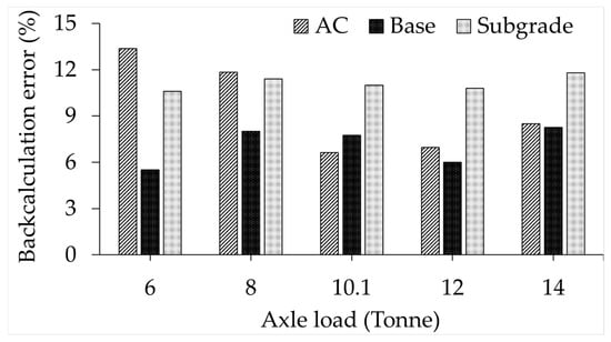 Table 6 presents the backcalculated moduli obtained using the Greenwood Engineering TSD backcalculation tool for various axle load magnitudes, which vary in this study due to the influence of pavement surface roughness. The 10.1-tonne (99 kN) load shown in the table corresponds to the static axle load adopted in this study, without any attenuation or amplification effects. Figure 12 illustrates the backcalculation errors, expressed as the percentage difference between the backcalculated modulus and the FEM modulus for each pavement layer, with the FEM moduli serving as the reference for comparisons.