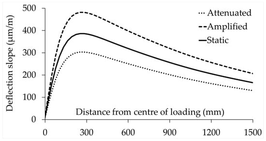 Figure 13 shows an example of deflection slopes obtained from attenuated and amplified loading analyses related to the PA state surface profile. It can be seen that both attenuated and amplified loading conditions have a significant effect on the deflection slopes compared with the case of the TSD’s static axle load. As a result, the influence of these changes in deflection slopes, caused by pavement surface roughness affecting the tyre load magnitude, on the backcalculated moduli of the pavement layers was examined.