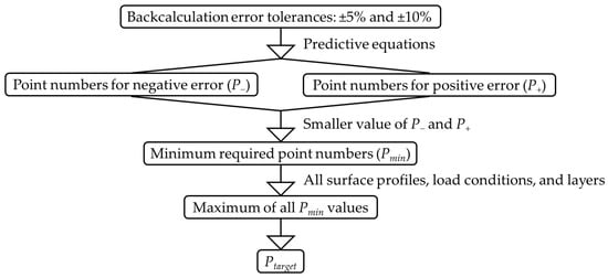 It should be noted that the maximum number of points in the point sets occurs when the 2.5 m auxiliary point set intervals are considered. Given the total profile length of 150 m, the maximum number of points in the point sets cannot exceed 61. This total of 61 points includes the point with the highest attenuation and amplification of the tyre load, along with 60 auxiliary points obtained by dividing the profile length of 150 m into 2.5 m intervals. Consequently, the predictive equations correlating backcalculation errors with the number of points in the point set are valid only when the calculated number of points does not exceed 61. Table 8 presents the MAPE values for the regression-based equations used to predict the backcalculated moduli from the number of points in the point set, which were then used to develop equations for predicting backcalculation errors from the number of points in the point set. As can be seen, all MAPE values for the developed predictive equations in Table 8 are below 3.2%, indicating high prediction accuracy based on the criteria presented in Table 9 [59].