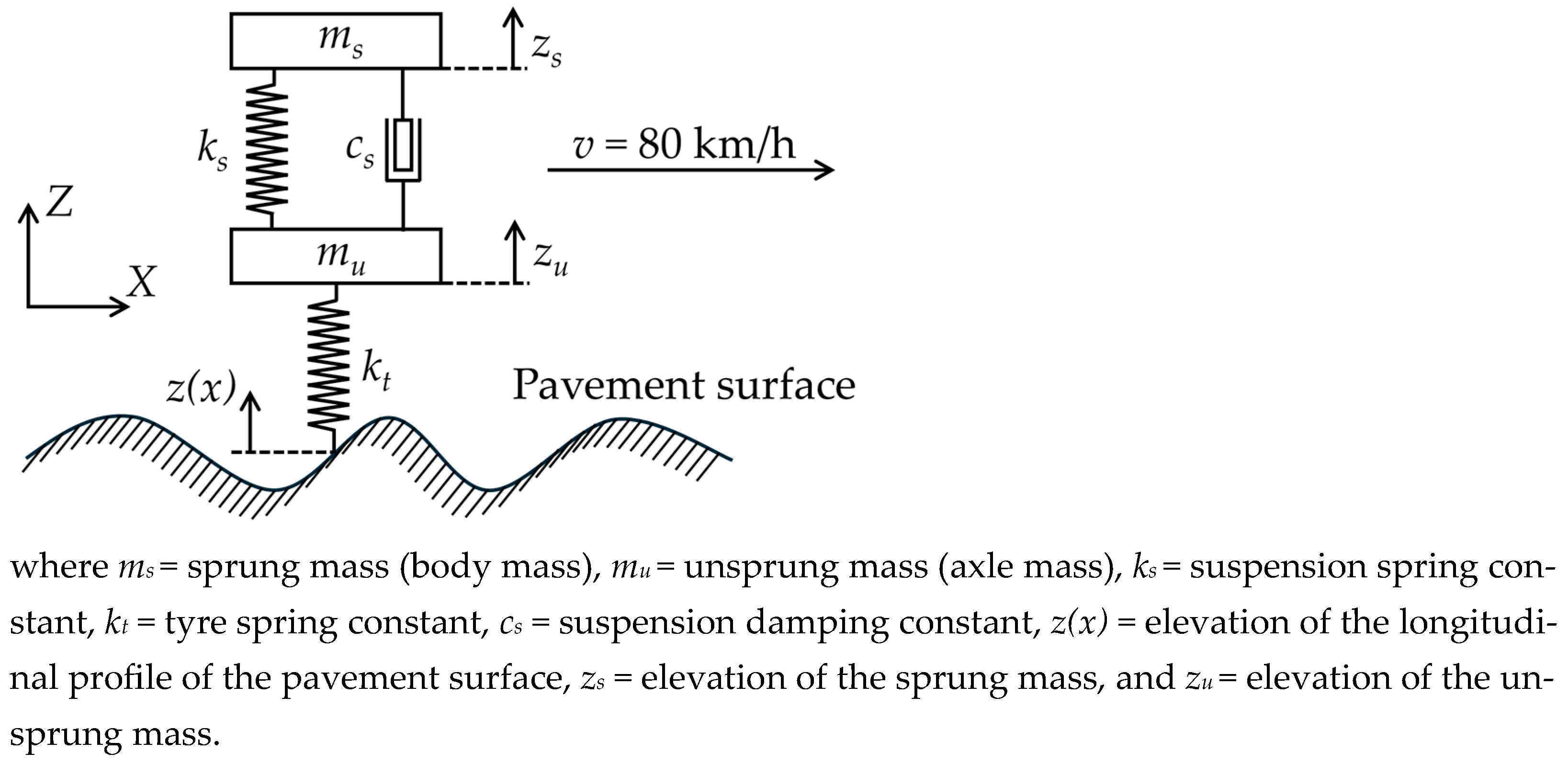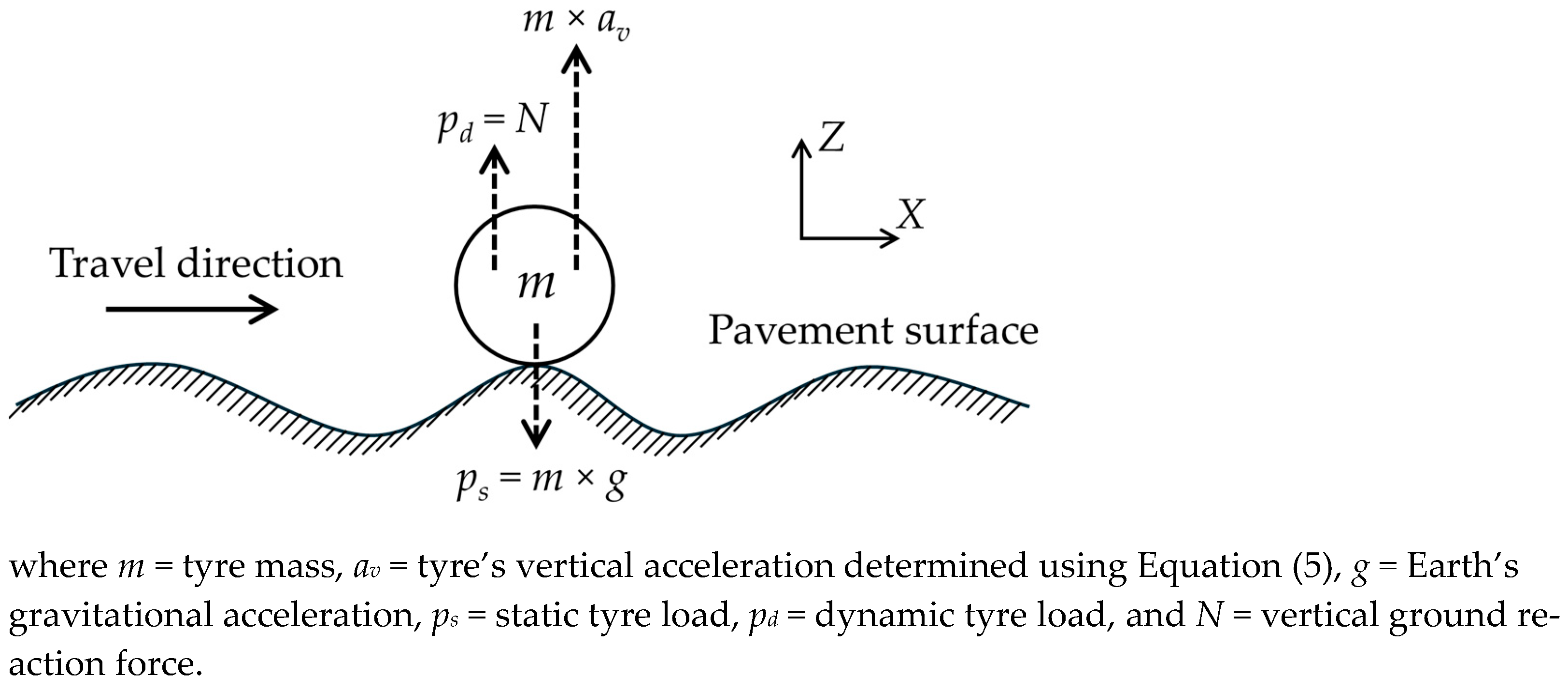 It should be noted that the dynamic tyre load is equal to the vertical reaction force exerted on the tyre by the pavement surface. Consequently, as shown in Figure 3, pd is equal to N. When the vehicle travels over a perfectly smooth pavement surface and no vertical acceleration arises from surface roughness, the dynamic tyre load becomes equal to the static tyre load, ensuring equilibrium of forces in the vertical direction.