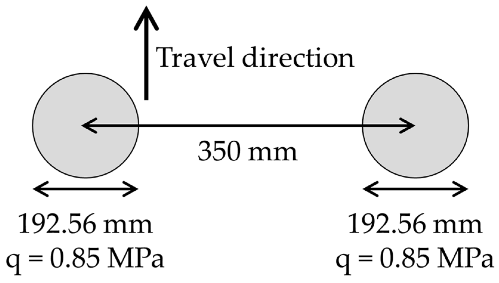 The total static load on the TSD trailer’s rear axle was obtained as 99 kN (24.75 kN per tyre), consistent with the load magnitude used in the MnROAD trials [8], and was assumed to be evenly distributed across all tyres. The tyres were represented as equivalent circular areas, with a constant contact pressure of 0.85 MPa, a dual spacing of 350 mm, and an axle width of 1820 mm from centre to centre of the two dual wheels. These parameters match those used in the development of the Greenwood Engineering backcalculation tool. Equation (8) was used to calculate the equivalent circular loading radius for each tyre under a range of vertical accelerations. Figure 6 presents a schematic of the TSD trailer’s rear axle positioned over the pavement surface in the FEM model, while Figure 7 illustrates the static loading configuration on each side of the axle, with the static loading radius calculated using Equation (6). It is important to note that although the truck axle can influence surface deflections near the trailer axle, its effect on deflection slopes is negligible [52]. Consequently, the truck axle of the TSD was excluded from the FEM simulations. Furthermore, any potential influence of the truck axle in the analysis was eliminated by assigning a 9.8 kN axle load to the truck axle in the backcalculation tool, which is significantly lower than the 99 kN trailer axle load. The loading configurations were defined using DLOAD subroutines [53] developed with Fortran code [54].