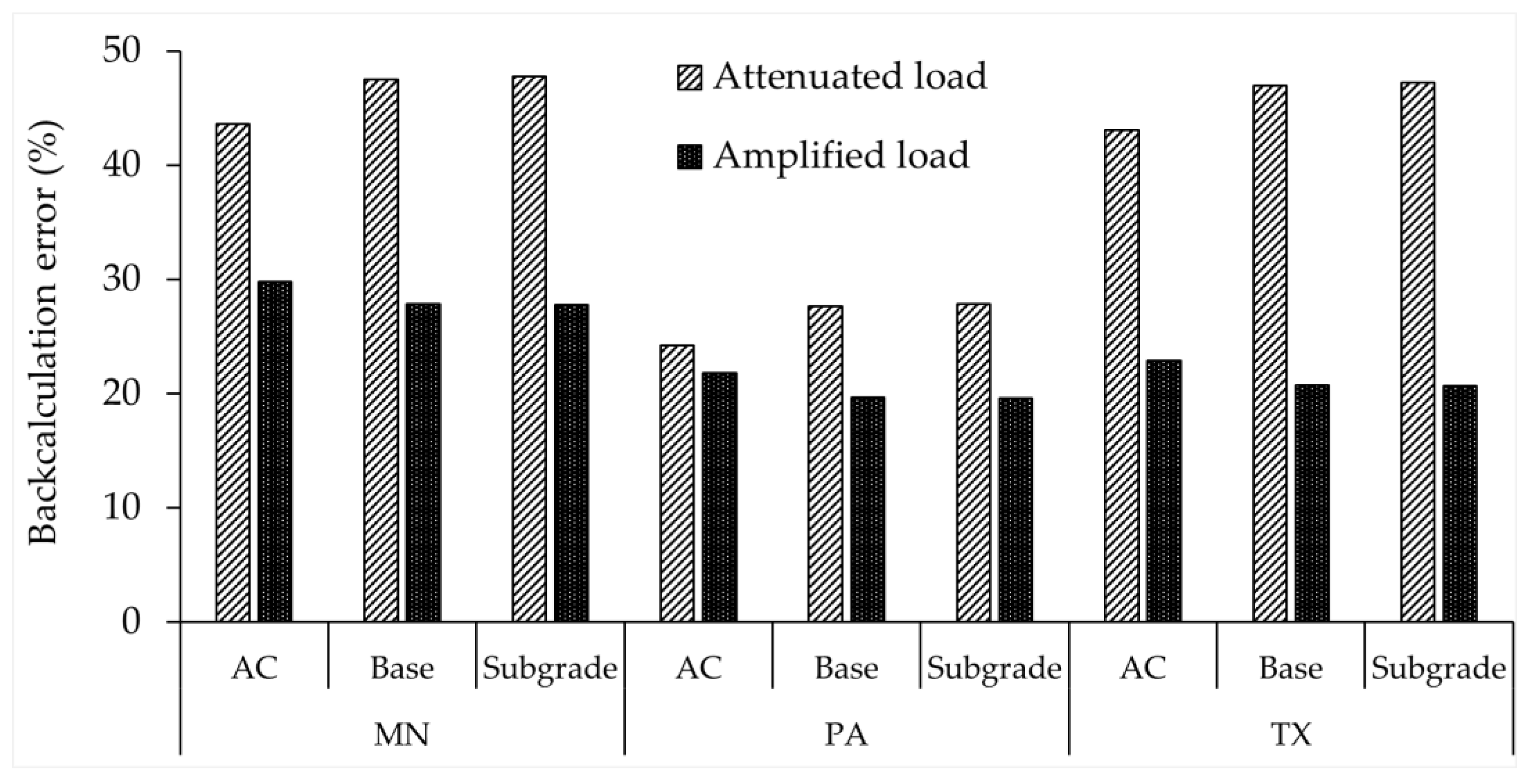 Backcalculation errors in highest attenuation and amplification loading conditions.