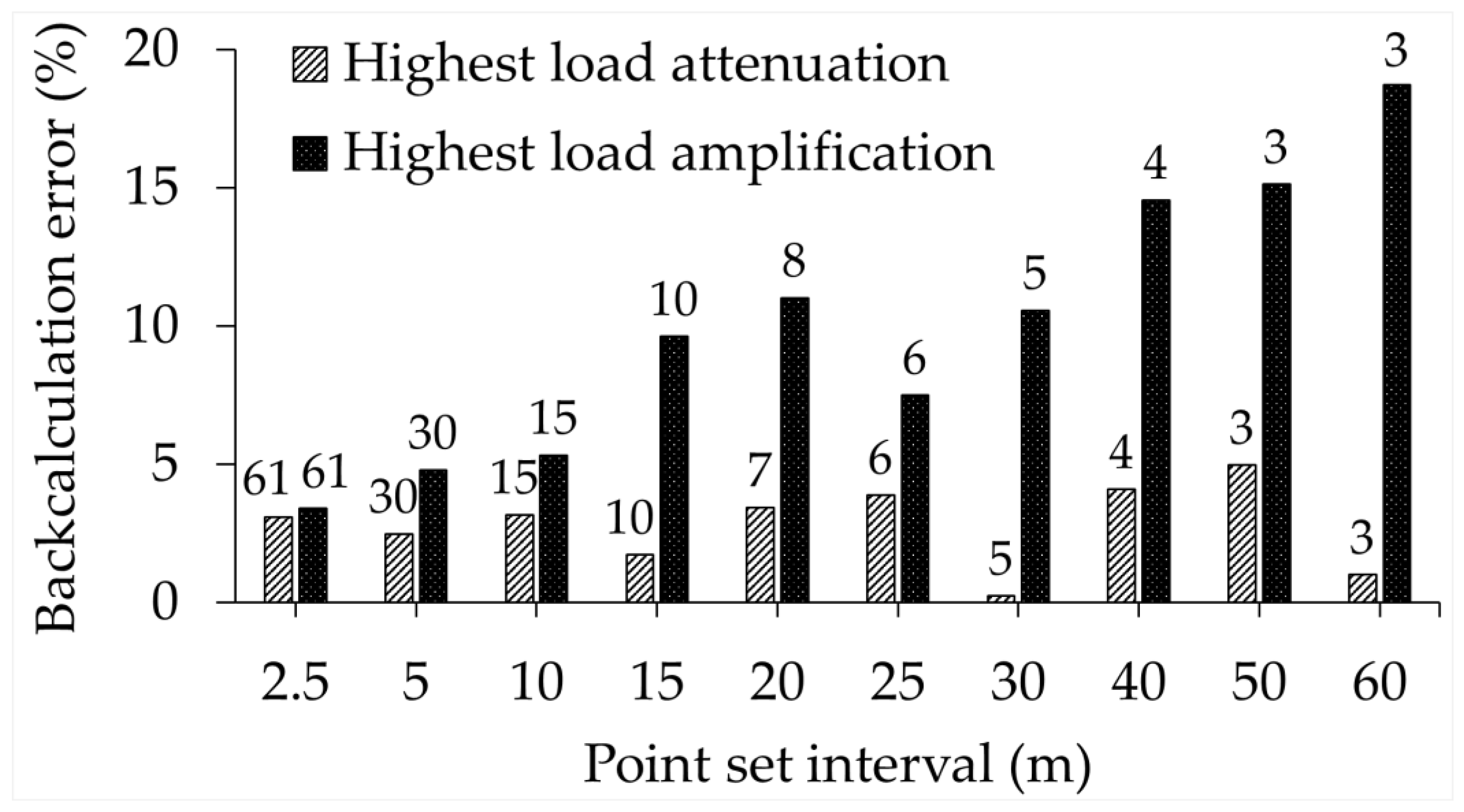 Backcalculation errors of AC layer by averaging deflection slopes in MN surface profile. (The numbers above the bars show the point count in each point set.)