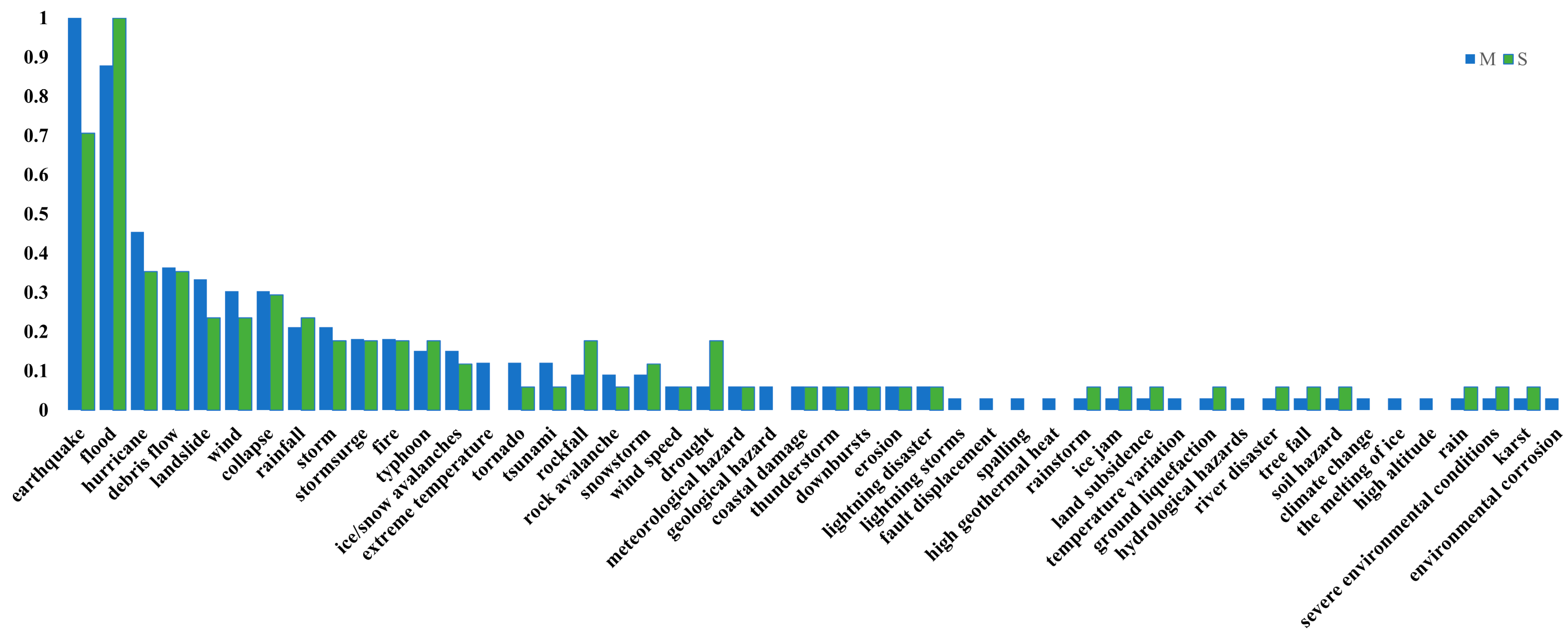 - Earthquake risks (F8) warrant particular attention in future research, as both simplified analysis and SNA highlight their frequency and significance in engineering projects [79]. However, a notable gap exists between theoretical discussions and applied models for F8 (earthquake), as evidenced by differences between matrices M and S in Figure 7.