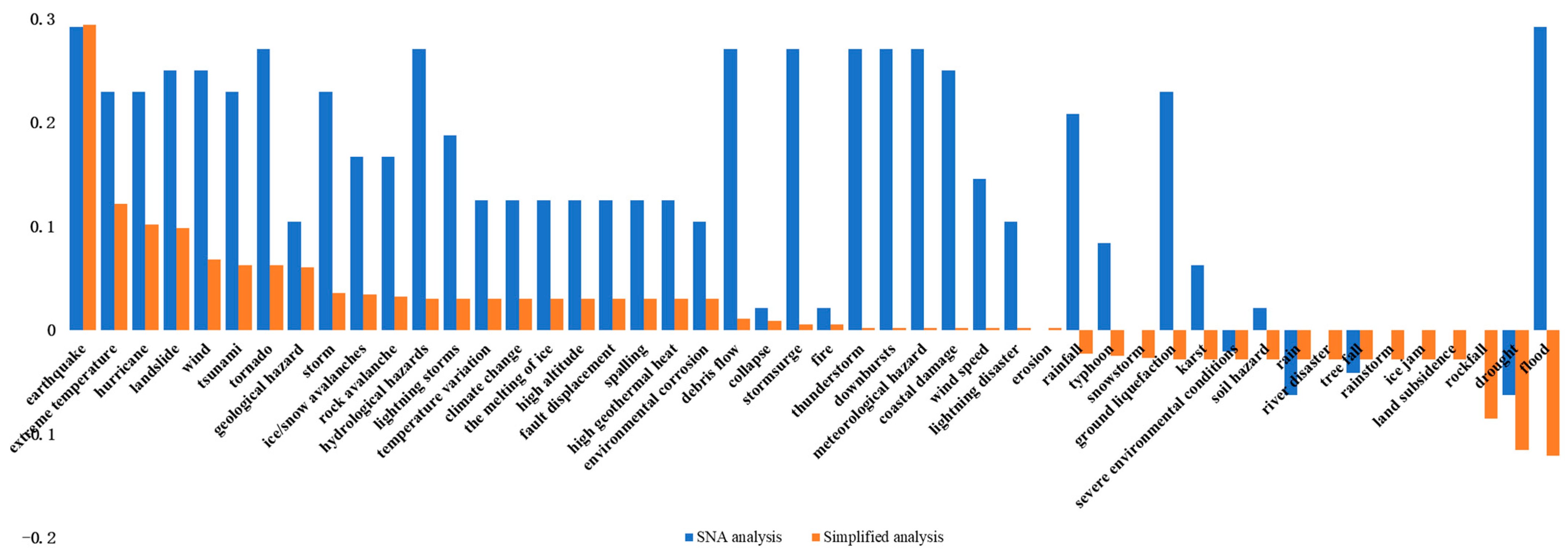 - Both F5 (flood) and F8 (earthquake) consistently rank highly in degree centrality, betweenness centrality, and eigenvector centrality, as well as in simplified analyses, reflecting their frequent discussion in theoretical and predictive models and their strong interconnections with other natural disaster risk factors. Previous studies have prioritized high-impact risks like F5 (flood) and F8 (earthquake), often neglecting other significant but less frequently studied risks, such as F12 (rockfalls), F23 (land subsidence), and F21 (ice jams).