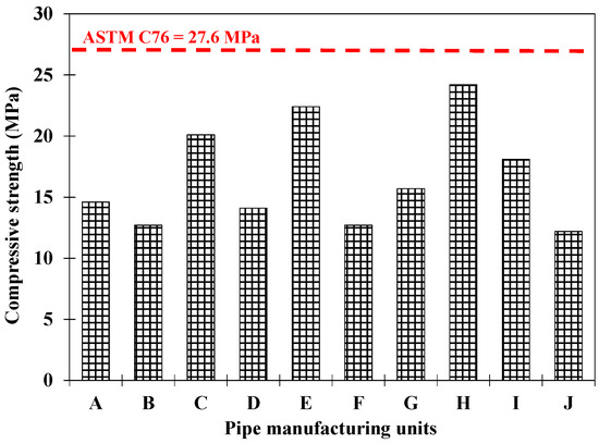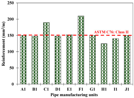 Initially, various local precast pipe factories were visited to examine the local practices and the material used for the industrial manufacturing of full-scale pipes. It was observed that not a single concrete mixture design was used in the visited factories. Various industries used different concrete mixture designs even for casting various sizes of pipes. Moreover, it was also noticed that the water/cement ratio used in their factories was relatively high (>0.70). The cement dosages varied between 220 kg/m3 and 325 kg/m3. Figure 1 shows the 28-day compressive strength achieved for the manufacturing of precast pipes. It was observed that the pipes manufactured in all of the pipe factories visited exhibited lower compressive strength than that required by ASTM C76 [33] (i.e., 27.6 MPa). The reinforcement provided in the manufacture of full-scale pipes also marginally satisfied the ASTM C76 guidelines [33]. Figure 2 shows the reinforcement provided by various local factories for casting their Class II pipes.