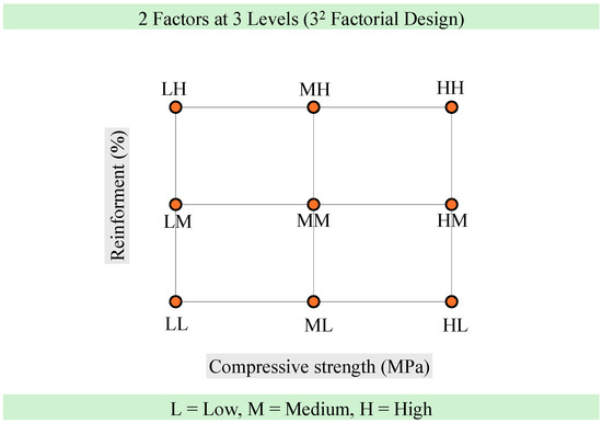 The design of an experiment is an efficient technique for dealing with a large set of data and factors to optimize the effects of various variables [36,37,38]. In this study, a 32 full factorial design was utilized to examine the contribution of the main factors and their interaction effects. Two factors, compressive strength and steel rebar reinforcement at three various levels (Table 1), were studied to evaluate the mechanical performance of the precast concrete pipes. These levels are considered as low (L), medium (M), and high (H) levels of concrete compressive strength and steel rebar reinforcement in precast pipes. A total of nine combinations (Figure 3 and Table 2) were tested based on the 32 factorial design, considering all the factors at various levels. All data were analyzed and processed using the Minitab Statistical package.