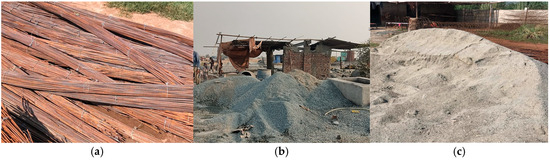 The concrete mixture for the selected combination based on the strength requirements was designed according to ACI 211.3R [34]. Table 3 shows the concrete mixture design used for casting various types of pipes with different compressive strengths. Figure 4 shows pictures of steel rebars and coarse and fine aggregates used for casting full-scale precast concrete pipes.