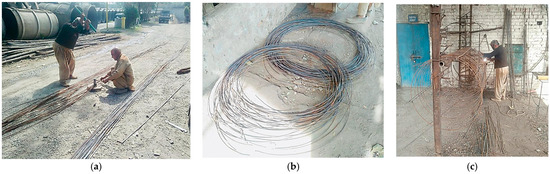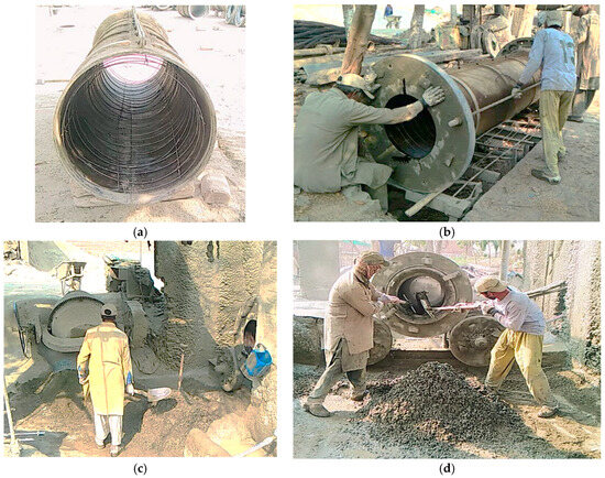 The tested pipes were cast through a locally available spin-casting technique. Initially, reinforcement cages were prepared on site using long steel rebars (Figure 5). The rebars used had a diameter of 5 mm and an ultimate tensile strength of 900 MPa. Longitudinal rebars were cut to the length of the pipe (2.43 m). Circular rings were prepared by rotating straight bars along a fixed ring assembly of desired circular diameters (Figure 5b). These rings were connected to longitudinal bars through welding (Figure 5c). Subsequently, these prepared cages were transferred to the pipe molds (Figure 6a). The pipe molds typically consisted of two half-circular steel plates that were joined together with nuts and bolts to form a circular mold of the desired size. The pipe molds were oiled from the inside and end rings were inserted at each longitudinal end of the pipe (Figure 6b). The inner sides of the end rings were used as a reference for achieving the desired wall thickness. The two end rings were connected through a rod and placed over the rollers of the spinning assembly. The concrete ingredients were mixed according to the design matrix (Table 2 and Table 3) in the surroundings of the spin-cast assembly using a rotating concrete mixer (Figure 6c).