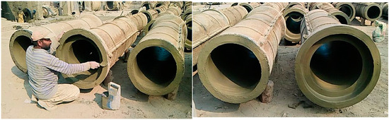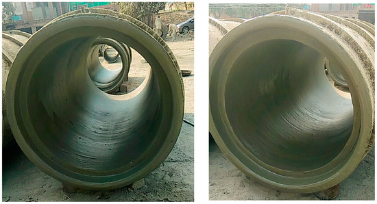 The concrete was then shifted to the platform and manually poured through two operators into the pipe mold, which was rotating on the runners (Figure 6d). Due to the rotation of the mold, the concrete mixture was forced to move to the outer side of the mold. The initial speed of rotation of the spin-cast assembly runners was slower (75 rotations per minute (rpm)) during the concrete feeding process. However, it increased to 325 rpm when the concrete was completely filled into the pipe mold. The rotation process continued for around 3 minutes to ensure that the concrete was placed all over the pipe mold and formed the required thickness of the pipe wall. It was noticed that excess water appeared on the inner surface of the pipe mold during rotation and it was removed manually with the help of a brush. Moreover, at the end, a dry cement–sand mixture was sprinkled to create a smooth inner concrete surface on the pipe (Figure 7).