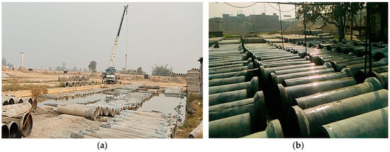 The efficient sewage system in any locality is very important for the daily routine of the surrounding neighborhoods. Due to the underground nature of the majority of sewer systems, it is very challenging yet critical to assess their existing conditions before any failure or disruption appears on the surface. Therefore, ensuring that a sewer system is suitable at the start of its design and prior to laying is vital and plays an important role in its long-term performance. Precast concrete pipes are currently employed in sewer systems due to their enhanced quality control, easy manufacturing and installation, and the economical solution they present for sustainable construction in rural and urban areas. Precast concrete pipes are manufactured using conventional steel rebars and prestressed wires for various applications [1]. In conventional reinforced concrete pipes, circular rings are provided to deal with the flexural stresses generated in the precast pipes, and longitudinal bars are provided for maintaining the exact spacing and position of the circular rebars. Furthermore, single- and double-reinforcement cages are used depending on the diameter of the pipe and its applications [2,3].