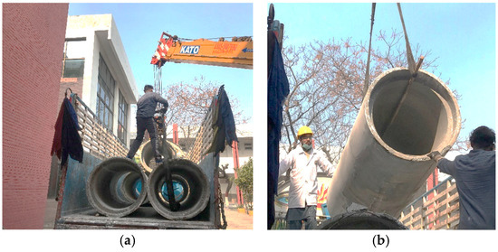 Transportation of pipes to the laboratory: (a) pipes in truck and attachment of lifter cable, (b) pipes transferred to laboratory for testing purposes.