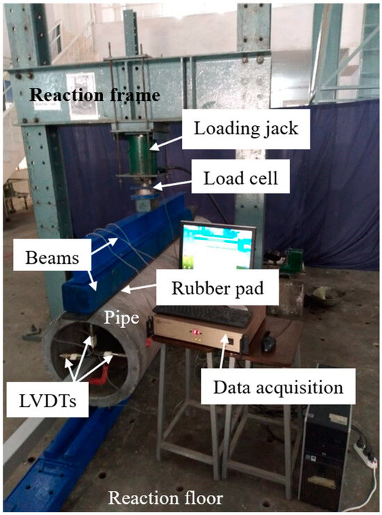In this study, reinforced concrete pipes without internal coating were tested. A TEBT was conducted by placing the test assembly on a reaction floor (Figure 11). Figure 12 shows a schematic of the TEBT setup for further clarification. A reaction frame was fixed to the reaction floor through 2-foot-long anchor bolts. A loading jack assembly was attached to the reaction frame along with a load cell for monitoring the applied load. A flat steel frame was placed on the reaction floor, on which the lower bearing was fastened. The lower bearing consisted of two wooden supports, each around 52 mm wide and 28 mm thick, spaced 52 mm apart. The manufactured pipe was seated on this lower bearing. A 22 mm thick rubber pad was positioned on top of the pipe to distribute the load uniformly and remove any uneven concrete surfaces. A cubical cross-sectional wooden beam was placed on top of the rubber pad. A load was applied at the top of the steel beam, which was distributed to the pipe. At the cross-section of the pipe, linear variable displacement transducers (LVDTs) were installed to measure deformations. Two LVDTs were positioned at the springlines, and one LVDT was pointed at the crown to measure horizontal and vertical deflections, respectively. The load cell and LVDTs were connected to an automatic data acquisition system for simultaneous data recording. During testing, personnel were assigned to different locations near the testing setup to monitor crack initiation and propagation. The load value at a 0.30 mm crack width was carefully noted by multiple operators. Additionally, the maximum load value acting on the pipe was recorded. Load was continuously applied until excessive deformations occurred in the tested pipe. At this stage, the load value remained constant. The load was then stopped, and the complete cracking pattern was mapped. Various pictorial views of the tested pipes were taken. Finally, with the help of a crane, the tested pipe specimen was removed from the TEBT assembly, and a new pipe was placed in to it for further testing. A total of eighteen pipes, as per the test matrix (Table 2), were tested, with two pipe replicates used for each combination.