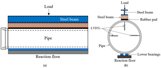 Schematic of three-edge bearing test setup for pipes: (a) longitudinal view, (b) cross-sectional view.