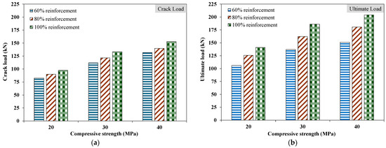Figure 14 shows the average of two replicate pipes for the crack and ultimate loads of the tested pipes. It was observed that the crack load of the tested pipes increased with a higher level of concrete strength. For instance, the pipe specimen made with concrete of 20 MPa exhibited a 0.30 mm crack load of around 90 kN compared to 140 kN for an identical pipe with 40 MPa concrete compressive strength at an 80% reinforcement level. Similar trends of increased crack load with higher strength were observed for specimens with 60% and 100% of reinforcement levels.