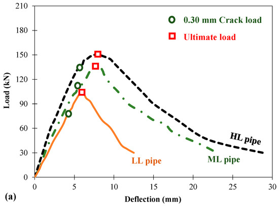 Figure 15 shows the load versus vertical deflection for all of the tested pipes. The general trend of the load–deflection behavior of the tested pipes was comparable. Ascending and descending branches of the curve were observed, representing the behavior of the pipe’s deflection under the application of load. It was observed that the initial slope (stiffness) of the curve was relatively higher for pipes cast with higher concrete strength and reinforcement levels. In the ascending branch, a constant slope of the load–deflection plot was observed up to the cracking point. Afterwards, the slope of the curve changed and reached the ultimate point. A continuous decrease in the load-carrying capacity of pipes was noted in the descending branch of the load–deflection curve.