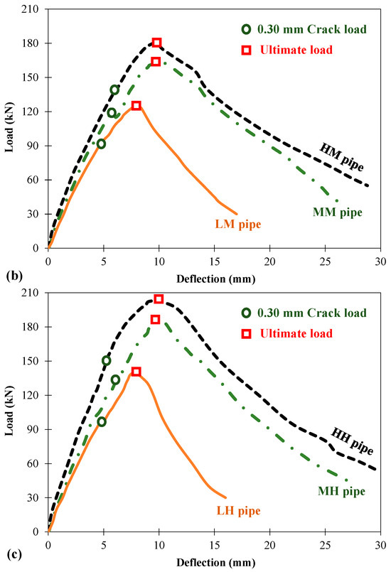 Load–deflection curve of tested pipes: (a) pipe with 60% of reinforcement, (b) pipe with 80% of reinforcement, (c) pipe with 100% of reinforcement.
