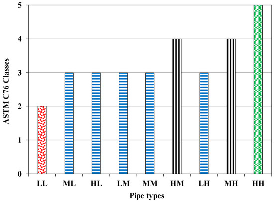 Figure 18 shows the classes of the tested pipes as per ASTM C76. For Class II, the 0.30 mm crack load (D0.3) and ultimate load (Du) limits are 50 and 75 kN/m/m, respectively. If D0.3 and Du loads are higher than 65 and 100 kN/m/m, respectively, the pipe can be categorized as Class III. For Class IV pipes, the D0.3 and Du loads limits are 100 and 150 kN/m/m, respectively. Similarly, for a pipe to be classified as Class V, the D0.3 and Du loads need to satisfy the 140 and 175 kN/m/m limits, respectively, as per ASTM C76. The tested pipes HL, MH, and HH, exhibited Class III, IV, and V, respectively, for 40 MPa concrete strength at various reinforcement levels. The tested pipes ML, MM, and MH can be classified as Class III, III, and IV respectively, for 30 MPa concrete based on their achieved D0.3 and Du loads. Similarly, pipes with 20 MPa concrete, i.e., the LL, LM, and LH combination, showed Class II, III, and III, respectively, at various reinforcement levels. It was observed that the classes of the pipes as per ASTM C76 were dominantly affected by the reinforcement levels; i.e., for the same concrete strength, the reinforcement levels changed the pipe class (Figure 18).