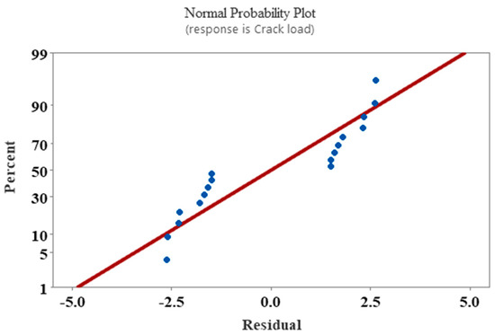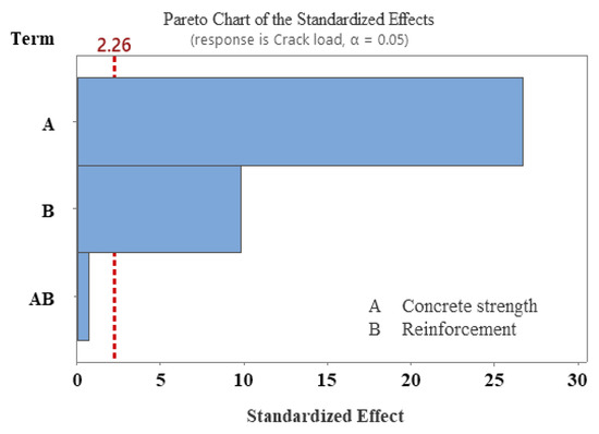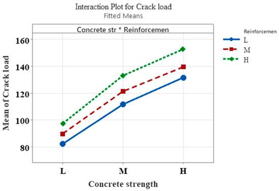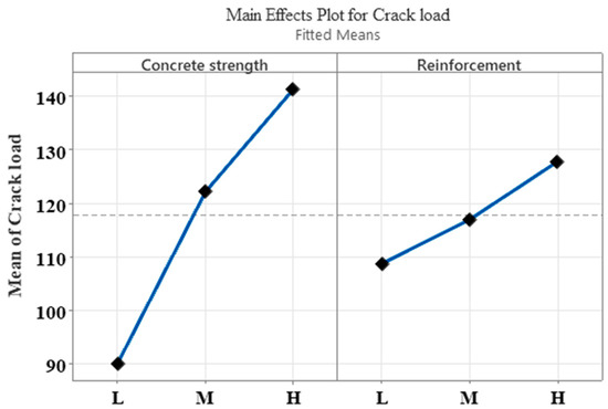 A Pareto chart was also plotted to observe the effects of main factors and their interactions on the crack load response. A t-test at a 95% confidence interval was performed and its value was 2.26, as shown in the Pareto chart (Figure 19) with a red dashed line on the vertical axis. In this study, it was observed that the concrete strength and reinforcement factors crossed the 2.26 value, indicating the significance of the main factors. However, their interactions were below the line (2.26), representing the insignificant effect of interaction on the crack load response. Figure 20 shows the normal probability graph for the crack load. This graph predicted the normal distribution of the data and analyzed the residual values. A few points deviated from the straight line; however, most of the values were aligned along the straight line (Figure 20). Similar findings were also reported in another study [41]. Figure 21 shows the main effect plots of concrete strength and reinforcement on the crack load. It was observed that the crack load increased when the level of concrete strength and reinforcement changed from a low level to a high level. Figure 22 shows the interaction plot of concrete strength and reinforcement for the crack load response. The interaction plot (Figure 22) showed parallel lines, indicating insignificant effects.
