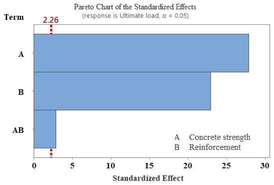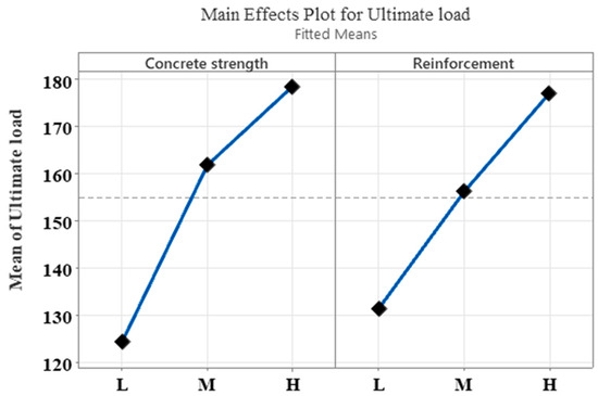 Figure 23 shows the Pareto chart for the main factors and their interactions on the ultimate load response. A dashed red line along the vertical axis in Figure 23 represents the T-value (2.26). It was observed that the main factors and their interactions crossed the 2.26 threshold, indicating their significant effects on the ultimate load. Figure 24 shows the factorial plot for ultimate load. It was observed that the ultimate load increased when the levels of concrete strength and reinforcement changed from low to high levels.