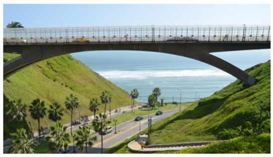 Figure 1), which is located in the Miraflores district in Lima, Peru, is taken as a case study. This bridge dates back to 1967 and passes over the “Bajada Balta” ravine. It has a two-lane road for vehicular passage and, years ago, it was bidirectional. However, due to its high traffic volume, the bridge has had traffic congestion problems and, therefore, a twin bridge was built in 2014—that is, a bridge with similar characteristics was built next to it, a new two-lane road bridge [