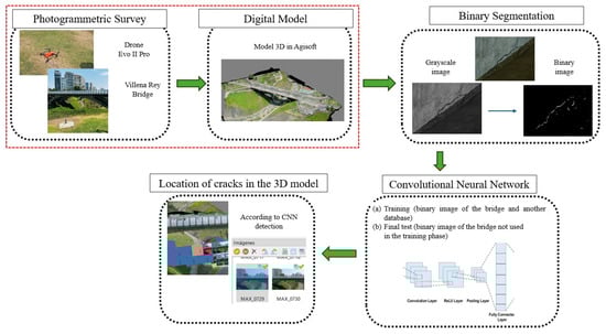 This section details the framework developed for damage detection improvements in the Villena Rey Bridge, which is based on the use of digital models and deep learning techniques for the development of convolutional neural networks (CNNs) capable of automatically detecting obvious cracks. The sequence of processes proposed in this study is illustrated in