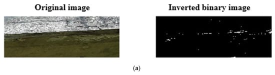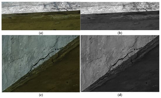 Figure 14d, a very clear white line is seen, but if the color version of that image is examined, that continuity is due to the pipe that runs through the bridge structure. Thus, it can also be determined that binary segmentation may emphasize and highlight continuities that are not necessarily cracks. One possible way to correct this detail is by using a database with a larger number of images for the CNN training phase. In this way, there will be more binary images with the presence of white continuities that are not cracks and the CNN, in its training, will detect this feature and will not detect them as cracks. Instead, it will improve the extraction of features from those that are cracks and will identify them more accurately. However, precision is never perfect; therefore, no matter how much training there is, the results must always be corroborated.