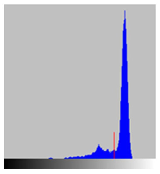 24]. To achieve this separation between the background and the image of interest, a threshold value, T, must be selected, which will be obtained from the gray-level histogram of the image. Said T value will be the one that classifies the pixels as background or as an object, assigning them a value of 0 and 1, respectively. With f(x,y) being the intensity value of a pixel of a grayscale image and g(x,y) being the value assigned depending on the T given to the pixel, we obtain the following [