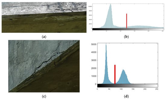Figure 8 shows two histogram results and mean threshold data for two images obtained from the bridge. However, these values are referential. Depending on the code configuration, this threshold value can be set manually to match the gray tones in the image. This was performed to obtain binary images with better highlighted and visible cracks, which can be seen in