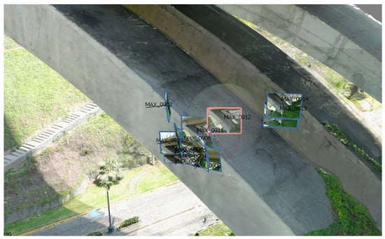 As a result of the investigation, a report of the damage located in the model will be obtained, as well as the precision and degree of reliability of the CNN in detecting the damage. When taking a photograph, the UAV has information about its exact location, which is necessary to carry out a “photogrammetry” process. This location is captured in the 3D model in the Agisoft software. In this way, it is possible to see which element of the bridge a photograph refers to.
