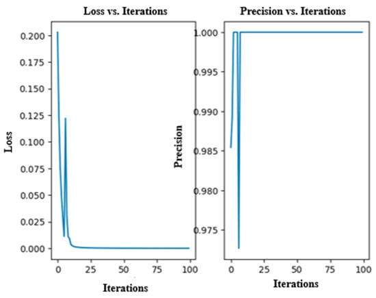 Figure 13. On the one hand, it can be observed how the loss decreases as the training iterations progress. Initially, the loss decreases rapidly, indicating that the model is learning and adjusting its parameters effectively. After about 25–30 iterations, the loss stabilizes close to zero, suggesting that the model has learned the patterns in the training data well and reaches a point where more iterations do not provide significant improvements; thus, the previously mentioned range is the ideal number of epochs to train the network. On the other hand, regarding the accuracy vs. iterations graph, accuracy improves rapidly at the beginning, showing that the model is learning to predict correctly. Additionally, very high accuracy values are observed quickly; that is, the model is capable of correctly classifying almost all samples. Finally, the accuracy stabilizes rapidly and remains close to 100%, indicating that the model maintains high performance after the initial iterations.