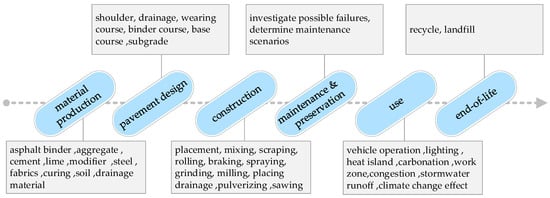 A life cycle assessment of an asphalt mixture is a systematic approach to evaluate the environmental impacts associated with all stages of its life cycle, from the extraction of raw materials to the production, use, and end-of-life of the pavement. This assessment helps identify critical points in the asphalt life cycle where environmental improvements can be made, such as reducing greenhouse gas emissions and the consumption of raw materials and energy resources. Recent studies emphasize the importance of considering various factors, including the selection of appropriate materials, construction methods, and maintenance practices, to achieve more sustainable asphalt design. The life cycle of any pavement includes different phases, including material production, construction, road operation and maintenance, and finally, end-of-life (Figure 1). Each of these phases can have significant environmental impacts, including energy consumption, greenhouse gas emissions, and other pollutants; therefore, it is essential to assess the impacts comprehensively throughout their entire life cycle.