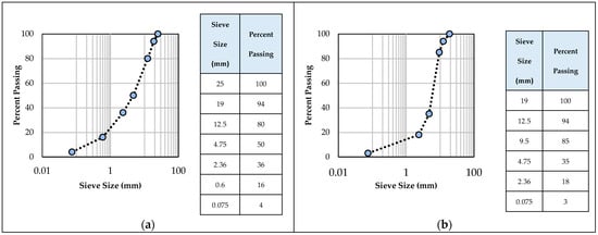 The mixing design was determined based on international regulations and guidelines, such as Caltrans, FHWA reports, and the Asphalt Institute MS2 guideline, with reference to previous studies [,]. The optimal binder content was also estimated, and the values for rubberized asphalts were modified compared to the conventional mixture, referencing the literature review [,]. The amount of materials needed to produce one ton of each mixture can be seen in Table 1. Additionally, the gradation chart is illustrated in Figure 3. Figure 3a depicts the dense-graded gradation used for HMA and RHMA-tb mixtures, while Figure 3b shows the gap-graded gradation applied for RHMA-dry and RHMA-wet mixtures.
