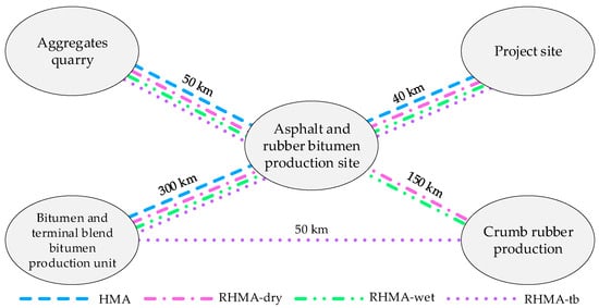 For the material production stage, the values were assumed according to the table above and for 1000 tons. For the production of crumb rubber, based on the available resources and specifications of the devices used, the time for using these devices was included in the modeling. The production time and temperature for the preparation of the asphalt rubber binder and terminal blend binder were considered to be 1 h at 190 °C and 2 h at 220 °C, respectively []. For transporting materials to the mix production site and the project construction site, the details of each mix and the distances considered are provided in Figure 4.