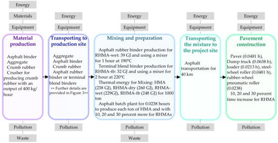 Praticò et al. conducted a study to assess the life cycle of pavement technologies with recycled materials (reclaimed asphalt pavements, crumb rubber, and waste plastics). The results show that the production of the materials has the highest contribution (60–70%) in all environmental aspects [].