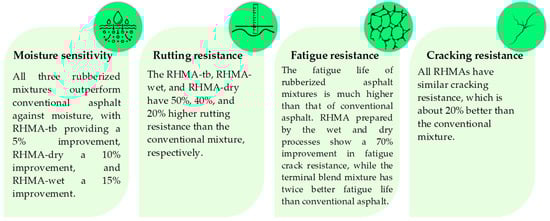 In addition to life cycle assessment studies of rubberized asphalts, numerous studies have been conducted to evaluate the performance of this type of material. In one study, Xie et al. investigated the dynamic modulus, rutting resistance, moisture sensitivity, and fatigue resistance of various rubberized stone matrix (SMA) mixtures through performance tests. The mixtures were produced in the laboratory using three processes: the dry process, the wet process with asphalt rubber binder, and the wet process with terminal blend binder. The results showed the following: (1) the incorporation of crumb rubber into SMAs improved the high-temperature dynamic modulus, rutting resistance, and fatigue life; (2) the production methods may affect the high-temperature dynamic modulus and rutting resistance while having no significant effect on the moisture sensitivity and fatigue life of the mixture; and (3) the use of a Styrene–Butadiene–Styrene (SBS) polymer and rubber blends in the terminal blend binder significantly improved the rutting and fatigue cracking resistance [].