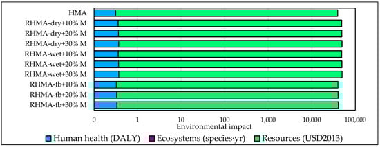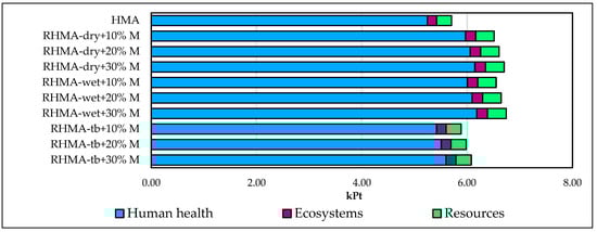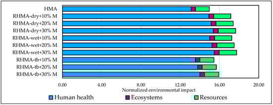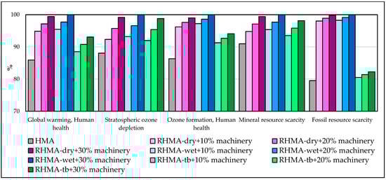 For instance, in the global warming potential category, RHMA-tb+10%M exhibits a reduction of approximately 8% compared to RHMA-dry+10%M and RHMA-wet+10%M. Similar trends are observed for the impacts on other categories, where the RHMA-tb mixtures outperform those obtained from the dry and wet processes. Due to lower mixing temperatures, equipment time, and a different mix design—specifically, lower binder content—the HMA sample remains in the green area across all categories.