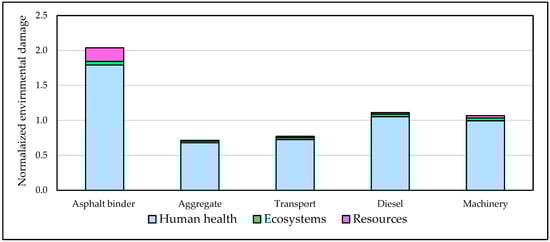 In this study, to perform an environmental comparison, all the data described in the previous sections were entered into the SimaPro software version 9.6.0.1. The rows used in the software were selected by reviewing previous studies and searching within the software database, based on availability []. For example, items “Bitumen, at refinery/kg/US”, “Gravel, crushed {GLO}| market for | Cut-off, U”, “Sand {GLO}| market for sand | Cut-off, U”, and “Inert filler {GLO}| sand to generic market for inert filler | Cut-off, U” were used for raw materials, the item “Transport, freight, lorry 16-32 metric ton, EURO3 {GLO}| market for | Cut-off, U” was used for transportation, the item “Diesel, burned in building machine {GLO}| market for diesel, burned in building machine | Cut-off, U” was used for thermal energy, and the item “Machine operation, diesel, >= 74.57 kW, high load factor {GLO}| machine operation, diesel, >= 74.57 kW, high load factor | Cut-off, U” was used for machinery.