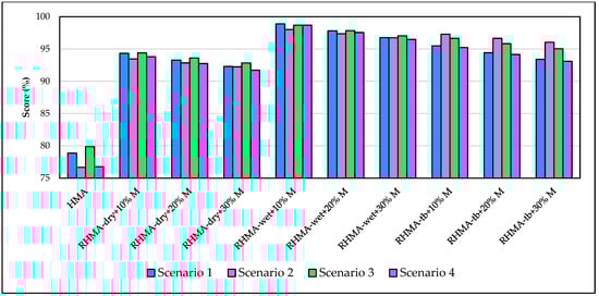 As shown in Table 2, the rubberized asphalt mixture prepared using the asphalt rubber binder (RHMA-wet) demonstrated the best performance. The mixture made with the terminal blend binder (RHMA-tb) followed closely in second place. The rubberized asphalt prepared by the dry process ranked third, with only a 5% performance difference compared to the other two rubberized asphalt mixtures; however, it still outperformed the conventional asphalt mixture by about 20%. It is important to note that the lifespan of unmodified asphalt was considered to be 10 years, and the lifespans of the mixtures were calculated proportionally based on this assumption. The scores and rankings were determined assuming that all asphalt mixtures were prepared and placed under optimal conditions, with construction defects considered to be negligible.