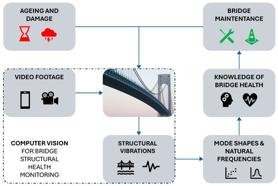 Bridges are critical components of our transportation network. Their fitness for purpose and conditions are paramount for public safety and the efficiency of transportation networks. Bridges require continuous monitoring and assessment to ensure their long-term operational viability [1]. Their maintenance is essential not only for the safety of their users but also for urban connectivity, fostering public life [2], and promoting economic growth [3]. Visual inspections are essential in assessing bridge conditions and preventing catastrophic events. Inspections, however, may be insufficient for a comprehensive understanding of bridge conditions, particularly when extensive diagnostic campaigns are not carried out or when certain infrastructure elements are difficult to access during regular inspection [4]. Moreover, inspections are subjective to inspectors’ interpretation of defects in the field and are laborious and expensive.