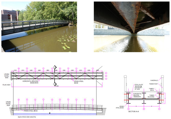 The proposed methodology is applied to a pedestrian bridge located at the University of Twente (UT) campus [34,35], the Netherlands, shown in Figure 3. The UT campus bridge, which has been in use since the 1980s, is intended for use by pedestrians and cyclists. It is 27 metres long and 2 metres wide and connects Sintelbaanveld in the west with Hogekamp in the east, crossing an artificial pond. The bridge structure consists of three longitudinal steel girders, diagonal bracings, and a hardwood board deck. It also has twenty-two timber railing posts bolted to the outer girders. A comprehensive SHM system was installed in 2022, including temperature sensors, accelerometers, strain gauges, and a local weather station [36].