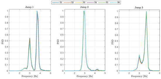 Normalized PSD of jump 1 (left), jump 2 (center), and jump 3 (right).