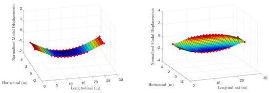 Mode shapes, which characterize the vibration patterns of a bridge, can be quantitatively defined by analyzing the amplitudes of the PSD derived from displacement measurements. This approach facilitates the identification of the structure’s vibration patterns. By extracting the amplitudes corresponding to each eigenfrequency, it becomes possible to map out the mode shapes, illustrating the spatial distribution of vibrations associated with each eigenvalue. In this study, the amplitude at the eigenfrequency of interest for each measurement location is selected to compute the mode shape corresponding to that eigenfrequency. The mode shapes associated with two specific eigenvalues are shown in Figure 9. To estimate these mode shapes, the modal displacement of the bridges is initially determined using the six closest targets to the camera locations, based on the image quality of videos recorded during jump 2. The remaining modal displacements are calculated by considering the bridge’s symmetry and the boundary conditions of the supports.