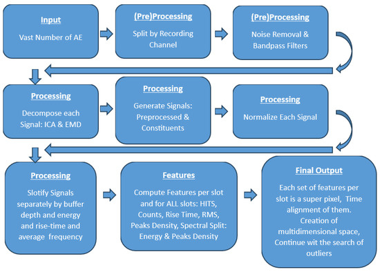 Our methodology layout from accepting the AE signals up to feature extraction and representation in a multidimensional space.