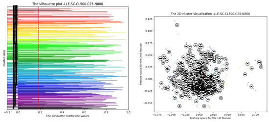 LLE dimension reduction: (left) silhouette values and (right) clustering (800 clusters) 2D projection, with x-axis the 1st feature (dimension) of the new reduced space due to LLE dimensionality reduction and y-axis the 2nd feature dimension.