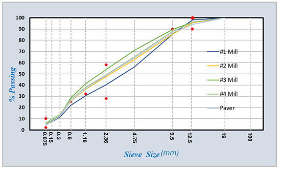 Extracted aggregate gradations of CIR millings from counties in Iowa [2,7].