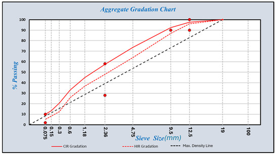 To compare the gradations of HIR millings against those of CIR millings, CIR gradations from nine counties of Iowa were compiled from previous research projects [10,11]. The CIR gradations from nine counties of Iowa are summarized in Table 2. The aggregate gradations of the HIR millings were then compared to those of the CIR millings. The average gradations of both the HIR and CIR millings are plotted along with the maximum density line in Figure 2. As can be seen from Figure 2, as expected, fines passing No. 200 of HIR millings were significantly less than those of CIR millings. Overall, it can be concluded that the average gradation of HIR millings was coarser than that of CIR millings by retaining the original aggregate gradations.