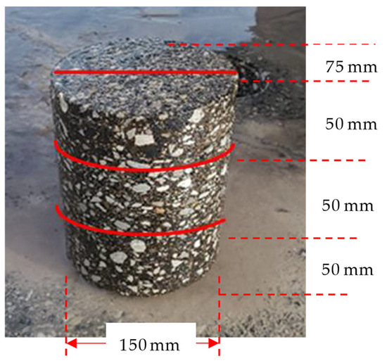 SCB tests were performed according to AASHTO TP 124 on the cores taken from US 34. As shown in Figure 3, samples for SCB testing were prepared by cutting the cores into semicircular specimens, each with a radius of 75 mm and a maximum thickness of 50 mm (with some samples thinner because field core samples have various thicknesses). A notch 15 mm long and 1.5 mm wide was made on the flat side of each semicircular specimen to induce cracking. All specimens were conditioned at 25 °C for 2 h before performing SCB testing.