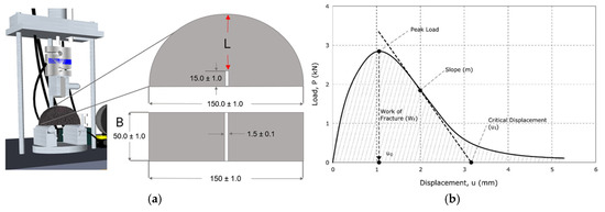 SCB test setup, dimensions, and force–displacement curve. (a) SCB test setup and dimensions of the test specimen; (b) force–displacement curve from SCB test.