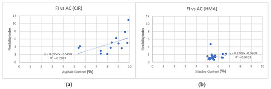 Plots of FI values versus binder contents for CIR and HMA samples. (a) FI values versus asphalt contents for CIR; (b) FI values versus binder contents for HMA.